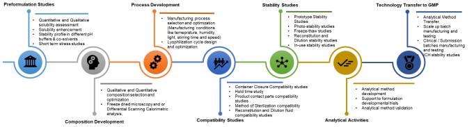 Our strong scientific team has broad experience and expertise in end-to-end formulation and development of injectable dosage forms (solutions, suspensions, and lyophilized drug product) with a focus on innovation, quality, speed, and cost-efficiency. Our services include performing solubility studies, composition design and optimization, process design and optimization, conducting accelerated and prototype stability studies as per the guidelines, hold time and compatibility studies, reconstitution studies and dilution studies, product container closure system identification, selection and finalization, but not limited to. We also provide support at customer-selected CMO for scale-up activities and manufacturing of clinical batches in a current good manufacturing practice (cGMP) environment.